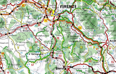 We decide to take rte 22, that green road up there that looks like a straight shot between Florence and Siena. We figure that the 40 kilometer or so drive will take at most 2 hours.