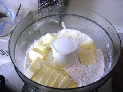 Process the flour, sugar and salt in a food processor to mix. Cut butter into pieces and add to the processor.