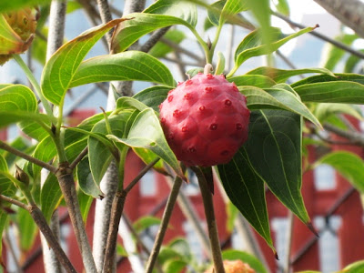 I had no idea that dogwood trees have fruit until this fall when our new Kousa Dogwood (Cornus kousa) began growing these lovely pods.