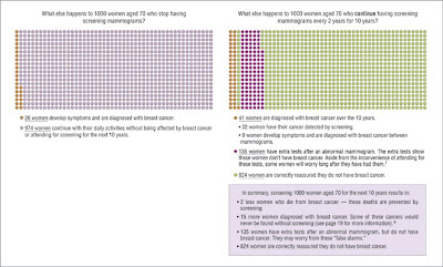 Bardiac, here is the article on the decision aid for mammograms for all women from the same author (Alexandra Barrett) as in the referenced article. She uses somewhat higher mortality reduction numbers than the accepted percentage, but I find it still interesting.